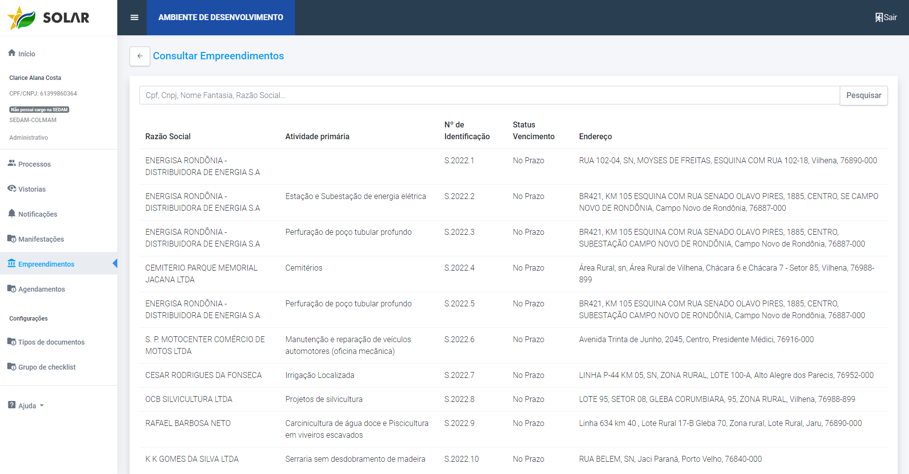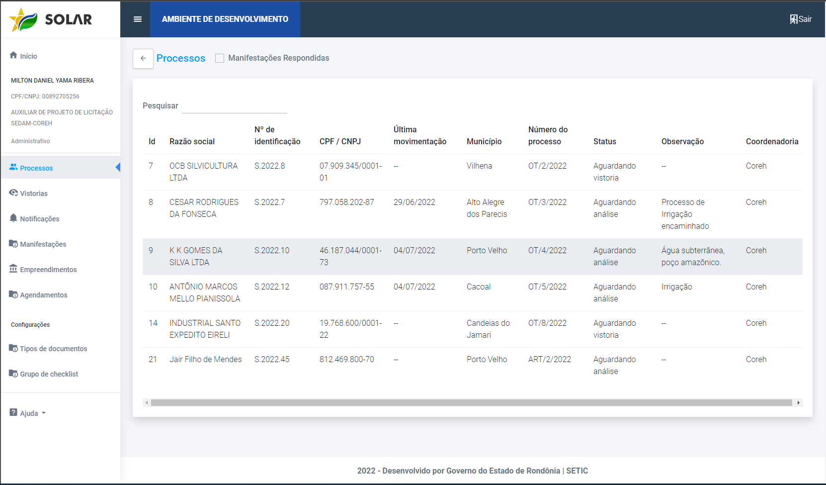 Sistema de Outorga e Licenciamento Ambiental de Rondônia (SOLAR) |