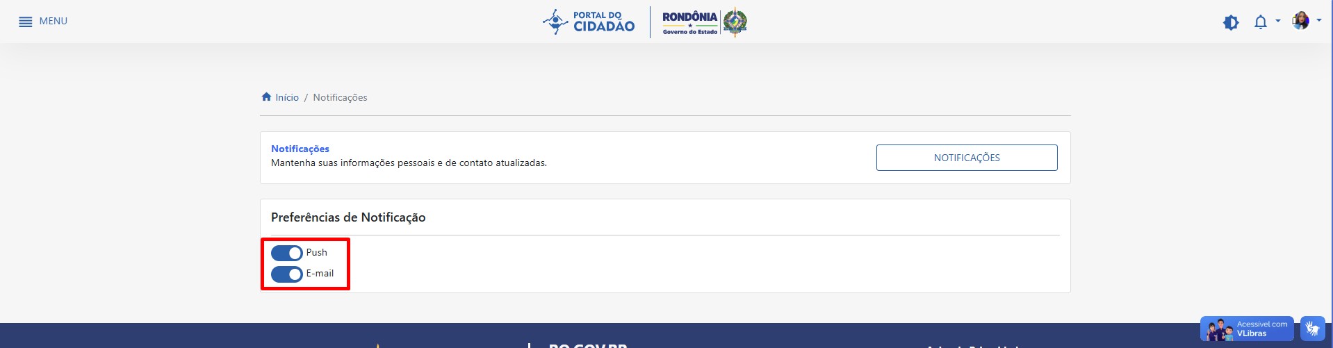 Na figura 7, o usuário pode habilitar as notificações, no navegador e e-mail, basta clicar em configurações e depois clicar no Push para navegador e no e-mail: