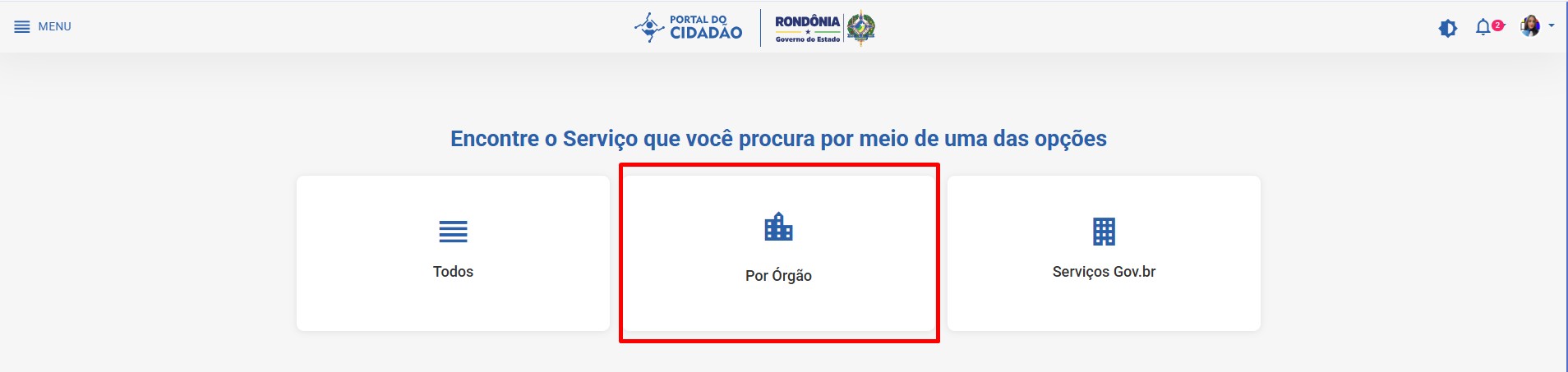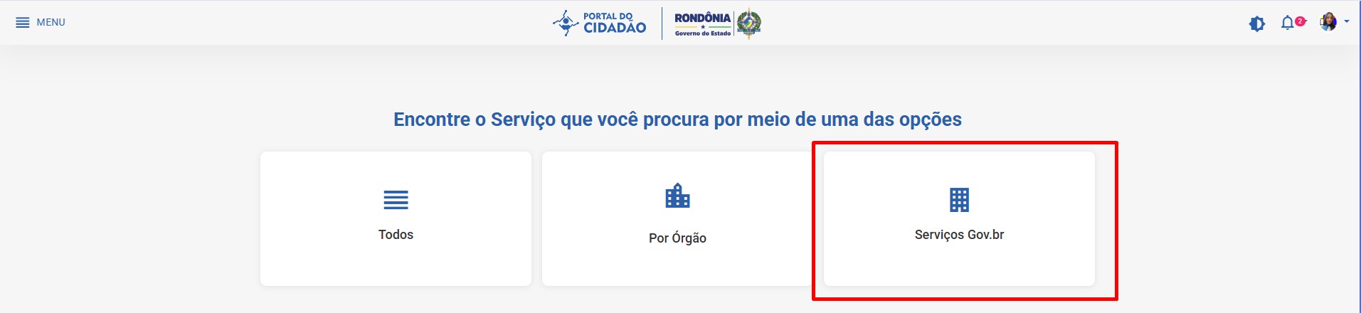 ㅤㅤㅤNa próxima página, pode-se selecionar uma das opções disponíveis: “Todos”,“Órgão” ou ser redirecionado para os serviços do Gov.br, que também tem os serviços do Portal do Cidadão.